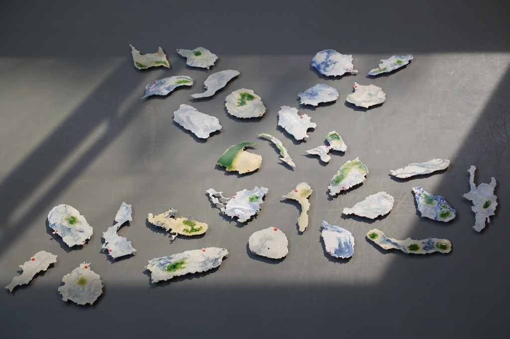 In der Arbeit „Inselarchiv. Eine transatlantische Spurensuche“ setze ich mich mit Inseln des Atlantischen Ozeans auseinander. Mich interessiert dabei in besonderer Weise die An- und Eingebundenheit dieser insularen Räume in weltumspannende Prozesse. Ich habe dazu in einem interdisziplinären künstlerisch-kulturwissenschaftlichem Forschungsprozess ein Archiv angelegt, in welchem ich Informationen zu materiellen wie immateriellen Artefakten zusammengetragen habe, die auf den spezifischen Charakter einer jeden Insel, sowie auf das Archipel und die Beziehungen darüber hinaus verweisen. Das können beispielsweise Lieder oder Gedichte sein, die im kapverdischen Kreol verfasst sind und die Migrationsgeschichte des Archipels thematisieren oder religiöse Erzählungen der Santería aus Kuba, einer synkretistischen, afroamerikanischen Religion. Wesentliche Verbindungslinien ergeben sich bei all diesen atlantischen Inseln über ihre (post)koloniale Geschichten, die auch in der Arbeit eine klare Sichtbarkeit erfahren. Übertragen habe ich die gesammelten Artefakte in eine installative großflächige Emaillearbeit, die aus einem Ensemble einzelner aus Stahlblech gelaserter Inseln besteht. Emaille als Material erlaubte es mir, die Geschichten der einzelnen Inseln im wahrsten Sinne des Wortes zu „schichten“, also unterschiedliche (Bedeutungs)Ebenen aufzutragen. Mittels verschiedener Emailletechniken (wie Handschrift, Mischung von Industrie- und Schmuckemaille, Siebdruck) entsteht so ein dichtes Inselgefüge, welches sowohl durch seine formal-ästhetische Gestaltung, als auch durch inhaltliche Bezüge zusammengehalten wird. Die Arbeit besteht aus 30 einzelnen Inseln, die auf kleine Klötzen leicht über dem Boden schwebend im Raum präsentiert wird. Beigefügt ist der Arbeit ein Booklet, in welchem die Informationen zu den einzelnen Emaille-Inseln zusammengefasst, sowie durch Übersetzungen und einen Index ergänzt werden.